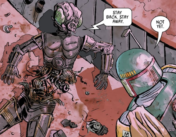 Jakiś czas wspólnie z Zuckussem zainteresowali się zleceniem na Fetta, które wystawił Jabba. Na Nar Shaddaa namierzyli należący do niego Slave I i po przejrzeniu pokładu nie znaleźli spodziewanego tam Hana Solo, którego Boba miał dostarczyć do Jabby. Podłożyli pod frachtowiec detonator termiczny, a gdy Fett powrócił do statku, Zuckuss wysadził ładunek i wyszedł mu na spotkanie. Mandalorianin zdołał jednak przechytrzyć go i po chwili wycelował w mężczyznę blasterami. Wówczas 4-LOM zaszedł go od tyłu i zmusił do opuszczenia broni, po czym wyjaśnili mu, że puszczą go wolni, jeśli powie gdzie znajduje się Han Solo. W odpowiedzi Fett aktywował działka laserowe Slave'a I, które swoim ogniem trafiły obu łowców. 4-LOM został poważnie uszkodzony, a gdy Boba pozbył się Zuckussa, odciął głowę droida i zabrał go na pokład, aby podpiąć pod komputer. LOM próbował walczyć z ogranicznikiem, lecz bezskutecznie. Wyjawił Bobie, że powodem ich spotkania jest zlecenie Jabby, w którym dostarczenie Solo miało być jedynie dodatkową szansą na premię. Wówczas Fett poleciał do pałacu Jabby na Tatooine, gdzie zabrał ze sobą głowę 4-LOM. Przed budynkiem droid próbował przekonać go, że może być użyteczny w negocjacjach z Huttem, lecz Boba nie przychylił się jego opinii i wyrzucił jego pozostałość w przepaść.[1]