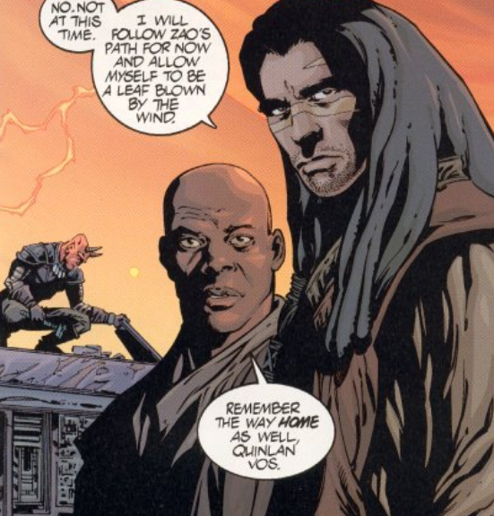 Wkróce Mace odnalazł go na ulicach Coruscant, kiedy próbował wymierzyć sprawiedliwość zidentyfikowanemu jako sprawca jego defektów z pamięcią senatorowi Chromowi Freyowi Kaa. Mace przeszkodził mu i zawezwał Vosa do odłożenia miecza, zapewniając rozliczenie senatora przed sądem, lecz Quinlan uznał, że za poczynione zło ten zasługuje na śmierć. Windu chcąc chronić go przed poddaniem się ciemnej stronie, podbiegł w kierunku Kiffara, na co ten potraktował go kopnięciem w twarz. Następnie mężczyźni wyjęli swoje ostrza i rozpoczęli walkę, podczas której Mace próbował wyperswadować przeciwnikowi, że jako Jedi zawsze był wysoce szanowany w szeregach Zakonu, lecz Vos w związku z obroną Chroma uznał Windu za wroga, po czym padły kolejne wymiany ciosów. Przedstawiciel Rady walczył jedynie defensywnie, licząc, że do jego oponenta przemówi jeszcze rozsądek, lecz ten wyraźnie oddawał się wściekłości, mając na celu zabicie go. W pewnym momencie wyskoczył w górę i poderwał do ataku stado latających zwierząt, które Windu w odpowiedzi uspokoił. Quinlan zechcial poznać powód, dla którego ten stawał w obronie senatora, na co Jedi wyjaśnił mu, że tak na prawdę ma na celu ochronę jego, gdyż zabijając w złości przepieczętuje swój los i odda się bezpowrotnie ciemnej stronie, po czym dla uwiarygodnienia swoich intencji wyłączył swój miecz. Odmówił dalszej walki i zapowiedział, że aby zabić Chroma, najpierw będzie musiał pozbawić życia jego samego, czego po chwili namysłu Vos odmówił. Odłożył swój miecz i zrozumiał, iż w głębi siebie jest nadal Jedi, po czym wyraził chęć odbycia powtórnego szkolenia. Następnie mężczyźni pokierowali się w stronę świątyni, a Quinlan poprosił Mace'a o zajęcie się sprowadzeniem Aayli, aby również ona mogła powrócić do zakonu po utracie pamięci, co też Windu mu zagwarantował.[22]