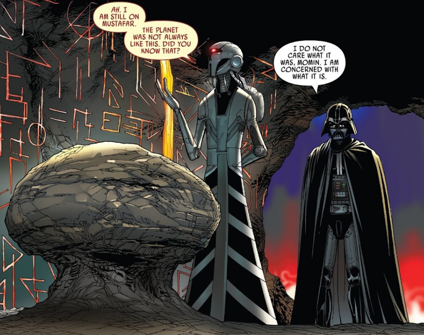 Gdy Vader powrócił do jaskini, użył Mocy na komorze i wyeliminował atakujące go wojska Mustafarian. Wówczas Darth Momin wyszedł mu na spotkanie i podziękował za ocalenie twierdzy, na co ten przypomniał mu, że zawczasu ostrzegł go przed konsekwencjami zdrady. W odpowiedzi pradawny Sith uznał stan jego zbroi za poważnie naruszony i aktywował swoje miecze świetlne, aby stanąć z nim do pojedynku. Wyczuł w nim naiwną nadzieję na bycie wybrańcem Mocy, podczas gdy ta kpiła z niego, między innymi odbierając mu żonę. Dodał, iż to ich obowiązkiem jest służenie Mocy, aby mogła nagradzać ich za poczynione efekty, podczas gdy liczne twory na wzór Imperium Galaktycznego przez epoki powstawały i upadały. Gdy doszło między nimi do wymiany ciosów, Momin kilkukronie zranił Vadera, aż finalnie odciął jego prawe przedramię. Gdy jego przeciwnik upadł na kolana, Momin zamachnął się, aby zadać ostateczny cios, lecz ten wstrzymał go, aby zapytać, czy kłamał o tym, co kryje się za drzwiami jaskini. W odpowiedzi pradawny Sith zaprzeczył, lecz stwierdził, że Moc nie pozwoli mu przez nie przejść, gdyż błędnie rozumie jej ciemną stronę. Wówczas Vader wykorzystał jego skoncentrowanie się na monologu i użył Mocy do pchnięcia w niego jednym z elementów komory, który przygniótł Momina do ściany. Będąc miażdżonym ten uznał atak za bezskuteczny, gdyż ciemna strona kocha go i chce, aby żył. W odpowiedzi Vader docisnął ement mocniej, czym ostatecznie pozbawił go życia.[2]