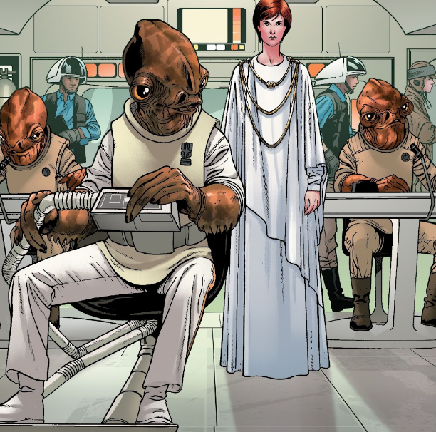 Opis: Gial Ackbar i Mon Mothma na Ab Dalis. Źródło: Star Wars 15: Przyjaciele i wrogowie Autor: Ramon Rosanas Licencja: Ta grafika jest chroniona prawem autorskim, wykorzystano ją tu dla ilustracji autonomicznego artykułu (lub artykułów), zgodnie z zasadą dozwolonego użytku, na prawie cytatu (Ustawa o prawie autorskim i prawach pokrewnych, art. 29). |