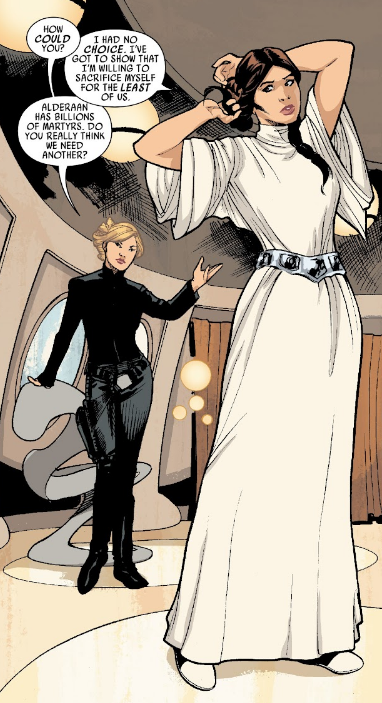Opis: Evaan Verlaine rozmawia z Leią Organą przed wymianą więźniów. Źródło: Księżniczka Leia, część 4 Autor: Terry Dodson Licencja: Ta grafika jest chroniona prawem autorskim, wykorzystano ją tu dla ilustracji autonomicznego artykułu (lub artykułów), zgodnie z zasadą dozwolonego użytku, na prawie cytatu (Ustawa o prawie autorskim i prawach pokrewnych, art. 29). |