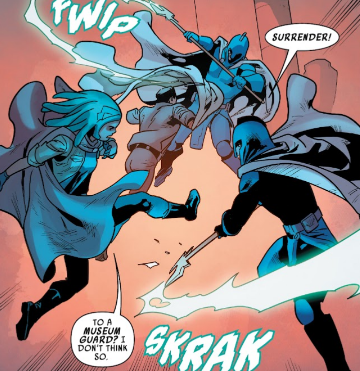 Opis: Frell i Kes Dameron w pojedynku ze strażnikami Muzeum Imperialnego. Źródło: Star Wars 7: Wola Tarkina, część 1 Autor: Ramon Rosanas Licencja: Ta grafika jest chroniona prawem autorskim, wykorzystano ją tu dla ilustracji autonomicznego artykułu (lub artykułów), zgodnie z zasadą dozwolonego użytku, na prawie cytatu (Ustawa o prawie autorskim i prawach pokrewnych, art. 29). |