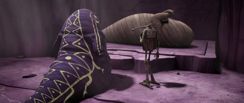 Opis: Grobowiec ojca Ziro. Źródło: Autor: Lucasfilm Animation Licencja: Ta grafika jest chroniona prawem autorskim, wykorzystano ją tu dla ilustracji autonomicznego artykułu (lub artykułów), zgodnie z zasadą dozwolonego użytku, na prawie cytatu (Ustawa o prawie autorskim i prawach pokrewnych, art. 29). |