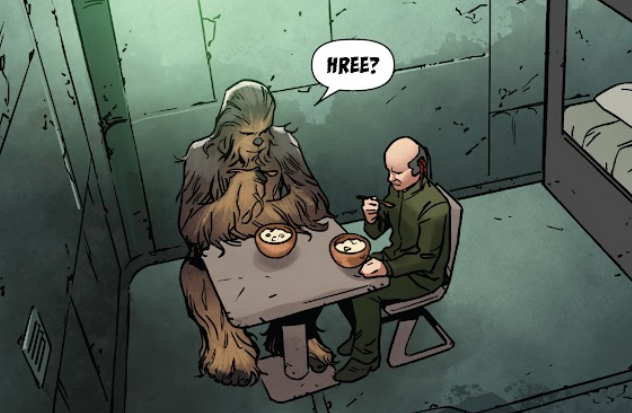 Opis: Lobot i Chewbacca w Kolonii Kezarat. Źródło: Star Wars 31: Kolonia Kezarat Autor: Andrés Genolet Licencja: Ta grafika jest chroniona prawem autorskim, wykorzystano ją tu dla ilustracji autonomicznego artykułu (lub artykułów), zgodnie z zasadą dozwolonego użytku, na prawie cytatu (Ustawa o prawie autorskim i prawach pokrewnych, art. 29). |