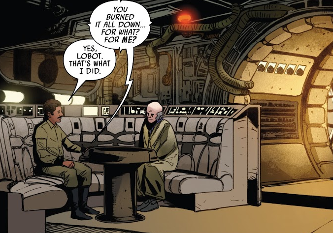 Opis: Lando Calrissian rozmawia z uleczonym Lobotem. Źródło: Star Wars 41: Lando utracony Autor: Madibek Musabekov Licencja: Ta grafika jest chroniona prawem autorskim, wykorzystano ją tu dla ilustracji autonomicznego artykułu (lub artykułów), zgodnie z zasadą dozwolonego użytku, na prawie cytatu (Ustawa o prawie autorskim i prawach pokrewnych, art. 29). |