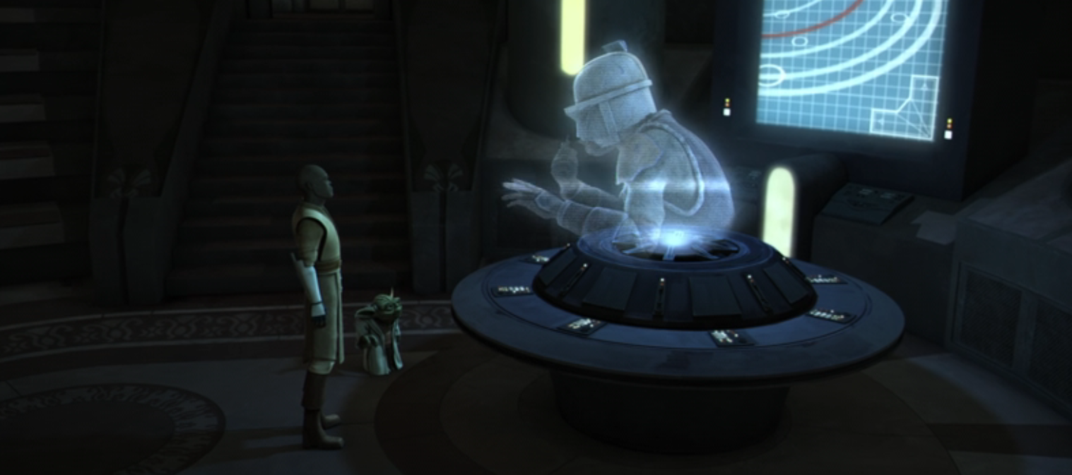 Opis: Obi-Wan Kenobi melduje postęp w misji Yodzie i Mace'owi Windu. Źródło: Autor: Lucasfilm Animation Licencja: Ta grafika jest chroniona prawem autorskim, wykorzystano ją tu dla ilustracji autonomicznego artykułu (lub artykułów), zgodnie z zasadą dozwolonego użytku, na prawie cytatu (Ustawa o prawie autorskim i prawach pokrewnych, art. 29). |