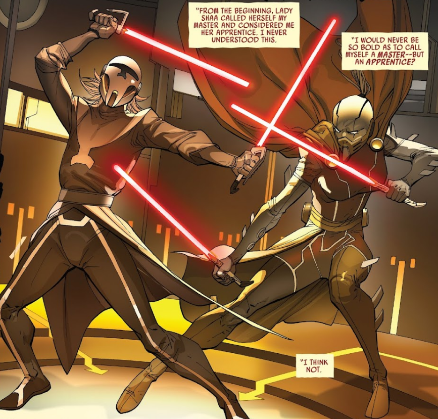Opis: Darth Momin i Darth Shaa. Źródło: Darth Vader: Mroczny Lord Sithów 22: Twierdza Vader, część 4 Autor: Giuseppe Camuncoli Licencja: Ta grafika jest chroniona prawem autorskim, wykorzystano ją tu dla ilustracji autonomicznego artykułu (lub artykułów), zgodnie z zasadą dozwolonego użytku, na prawie cytatu (Ustawa o prawie autorskim i prawach pokrewnych, art. 29). |
