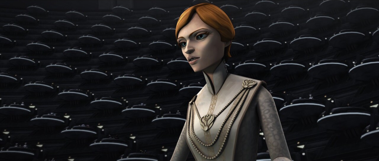Opis: Mon Mothma w Senacie Galaktycznym. Źródło: Wojny klonów (serial 3D) Autor: Lucasfilm Animation Licencja: Ta grafika jest chroniona prawem autorskim, wykorzystano ją tu dla ilustracji autonomicznego artykułu (lub artykułów), zgodnie z zasadą dozwolonego użytku, na prawie cytatu (Ustawa o prawie autorskim i prawach pokrewnych, art. 29). |