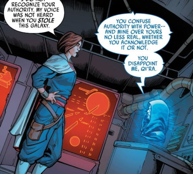 Opis: Qi'ra rozmawia z imperatorem Palpatine'em. Źródło: Ukryte Imperium, część 1 Autor: Steven Cummings Licencja: Ta grafika jest chroniona prawem autorskim, wykorzystano ją tu dla ilustracji autonomicznego artykułu (lub artykułów), zgodnie z zasadą dozwolonego użytku, na prawie cytatu (Ustawa o prawie autorskim i prawach pokrewnych, art. 29). |