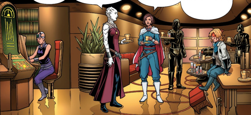Opis: Qi'ra zbiera meldunek od Margo. Źródło: Ukryte Imperium, część 2 Autor: Steven Cummings Licencja: Ta grafika jest chroniona prawem autorskim, wykorzystano ją tu dla ilustracji autonomicznego artykułu (lub artykułów), zgodnie z zasadą dozwolonego użytku, na prawie cytatu (Ustawa o prawie autorskim i prawach pokrewnych, art. 29). |
