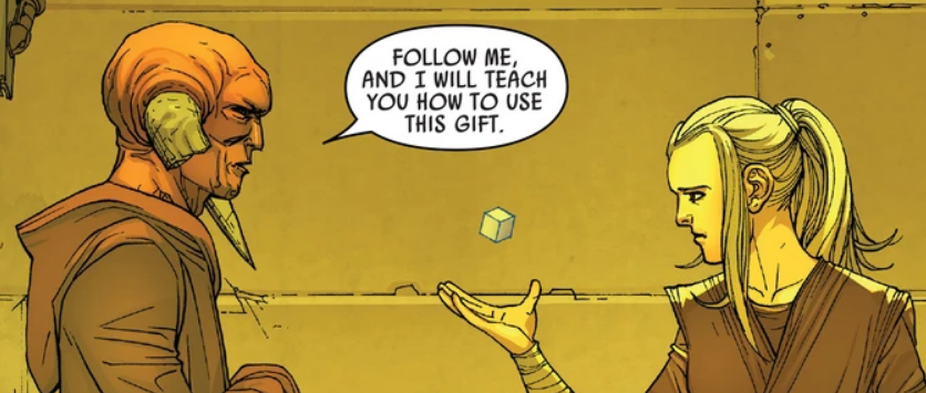 Opis: Ferren Barr poznaje Verlę. Źródło: Darth Vader: Mroczny Lord Sithów 17: Płonące wody, część 5 Autor: Giuseppe Camuncoli Licencja: Ta grafika jest chroniona prawem autorskim, wykorzystano ją tu dla ilustracji autonomicznego artykułu (lub artykułów), zgodnie z zasadą dozwolonego użytku, na prawie cytatu (Ustawa o prawie autorskim i prawach pokrewnych, art. 29). |