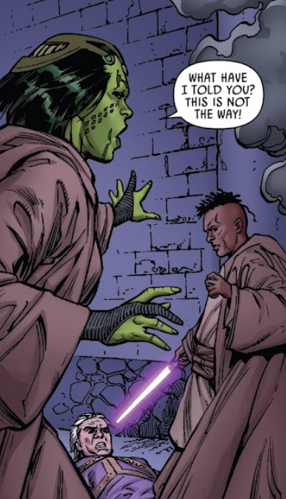 Opis: Cyslin Myr powstrzymuje Mace'a Windu przed dokonaniem samosądu na Droozie. Źródło: Mace Windu: Jedi Republiki, część 4 Autor: Denys Cowan Licencja: Ta grafika jest chroniona prawem autorskim, wykorzystano ją tu dla ilustracji autonomicznego artykułu (lub artykułów), zgodnie z zasadą dozwolonego użytku, na prawie cytatu (Ustawa o prawie autorskim i prawach pokrewnych, art. 29). |