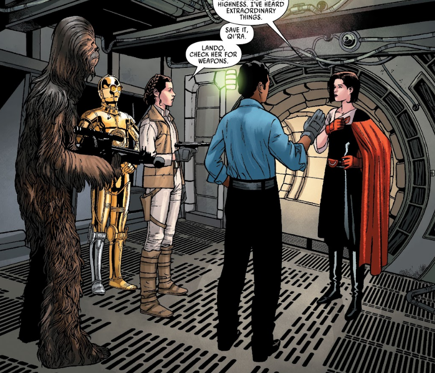 Przy ich spotkaniu pomagający Leii Lando sprawdził, czy nie ma ze sobą broni, przyznając przy okazji, że ta nieźle się ustawiła. W odpowiedzi Qi'ra nie odwzajemniła jednak komplementu i wspomniała o jego niedawnym utraceniu panowania nad Miastem w Chmurach. Po chwili ten pokazał Leii znalezioną przy Qi'rze butelkę Płomienia i datakartę, która wedle jej słów miała aktywować hipernapęd. Wspomniała, iż chce jedynie porozmawiać z księżniczką na osobności, a gdy reszta opuściła ładownię, udała się po kubki, aby rozlać trunek. Wówczas Leia zestrzeliła butelkę i pośpieszyła ją. Organa wystosowała współrozmówczyni zarzut o sprzedanie Solo, zamiast skorzystania z okazji i uratowania go. Qi'ra opowiedziała więc o wcześniejszych działaniach na ich korzyść, do których należało celowe przekazanie plotki o aukcji Amilyn Holdo, odciągnięcie uwagi Vadera w pojedynku i wywołanie konfliktu między Klanem Huttów a Imperium, aby dać im pole do odbicia Solo. W odpowiedzi Leia powiedziała, że mogła po prostu oddać go w ich ręce, lecz Qi'ra określiła za priorytetowe wygenerowanie zysku dla Świtu, a w tej sytuacji nie miałaby żadnej korzyści. Przyznała się do wykorzystania Hana i w związku z tym uznała, że lepiej będzie mu u boku Organy, gdzie spotkał go zasłużony los bohatera Rebelii. Opowiedziała historię z ich dzieciństwa, gdy stanął w obronie słabszego członka ich grupy, po czym Organa odparła, że doskonale zna prawdziwe oblicze Hana i nie potrzebuje być w tym utwierdzana. Zawołała Chwebaccę do przyjścia po Qi'rę z kajdankami, na co ta zatrzymała ją i dodała na koniec, że z jej wiedzy wynika, iż Solo wbrew wiedzy rebeiliantów przeżył zdarzenia z Executora i został przechwycony przez Bobę Fetta, który następnie sprzedał go Jabbie na Tatooine. Gdy zauważyła stojącego przy nich Chewiego potwierdziła prawdziwość swoich słów i zapytała księżniczkę o dalsze plany. Ta odparła, że Han jest obecnie bezpieczny, a jej czas lepiej będzie zagospodarować teraz dla Sojuszu, z czym zgodziła się Qi'ra. Następnie udała się w kierunku wyjścia z pokładu przekonując Leię, że rebelianci zyskają na działalności Świtu i ich antypatii do Imperium, po czym kobiety rozeszły się.[4]