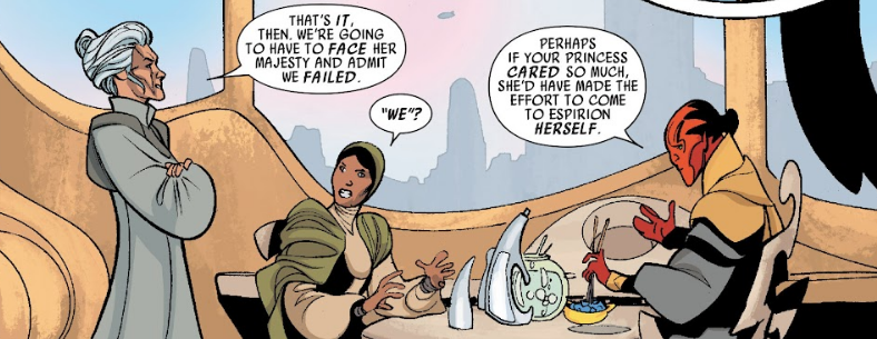 Na pokładzie spotkały się z Leią, która zobaczyła zgromadzone na orbicie statki Alderaanian. Organa spodziewała się nadchodzącego przybycia na miejsce gwiezdnego niszczyciela, przed którym mogłaby obronić ich espirońska flota, więc zapytała o pozyskany na powierzchni kontakt. Pareece wyjaśniła, że nie udało im się w pełni wykonać misji i Astane przyznała się do wszczęcia konfliktu z wymieszanymi rasowo Alderaanianami, na co księżniczka nakazała im obu opuścić pomieszczenie, aby mogła zastanowić się nad rozwiązaniem sytuacji. Wkrótce wystosowała przemowę do ludu, czym skutecznie zmotywowała swoich rodaków do zmobilizowania statków i wspólnego zniszczenia imperialnego okrętu. Gdy doszło do zwycięstwa, załoganci zaczęli wspólnie świętować, a Uwa zaczepiła Beona i zapytała go, czy nie boi się przybycia Imperium na Espirion. W odpowiedzi ten uznał, że imperialni musieliby liczyć się z siłą ich floty. Po zakończeniu misji Leia opuściła Alderaanian i powróciła do działań w Sojuszu Rebeliantów.