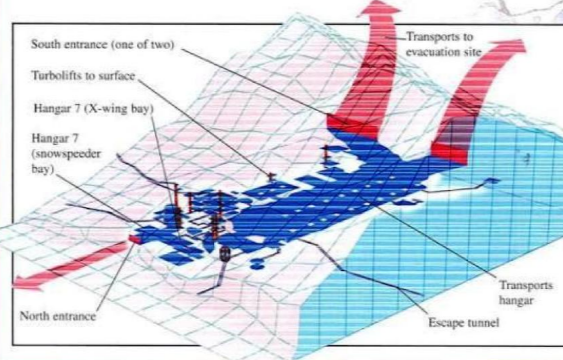 Od strony zachodniej mieścił się hangar z Y-wingami połączony ze zbiornikiem z ciekłym paliwem. Wychodziło się z niego na znacznie większe pomieszczenie, gdzie przechowywano transportowce i kilka X-wingów eskortujących większe dostawy. Wysoko zawieszony dach podtrzymywany był tam przez liczne lodowe kolumny wzmocnione plastalowymi prętami. Kursowały stamtąd busy pasażerskie dostarczające personel na powierzchnię planety.