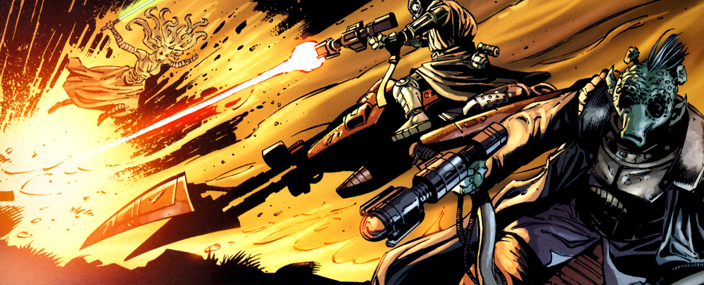 - Otrzymaliśmy raporty, zanim to się zaczęło. Ktoś wyznaczył nagrody za Jedi, a odłam gildii łowców nagród, Karmazynowa Nowa, zatwierdził ten kontrakt. Musimy dostać się do ich kwatery głównej... Przekonać ich, że to zły pomysł. Urządzić pokaz Mocy.
