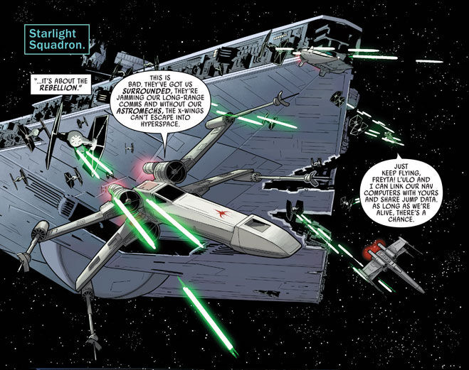 Pierwszym przystankiem Eskadry Gwiezdny Blask była Felucja, która była punktem zbornym Szóstej Dywizji. Jednakże tą komórkę imperialni zdążyli już zniszczyć, a na wszelki wypadek, gdyby rebelianci tam wrócili, zostawili sondy zwiadowcze. Po przybyciu na miejsce, piloci Sojuszu zobaczyli tylko szczątki i odebrali sygnatury imperialne. Wtedy też ich myśliwce zostały zaatakowane przez imperialne Vipery. Jedna z sond przyczepiła się do astromecha Evaan Verlaine i zaczęła się dobierać do jego archiwów, co doprowadziłoby do odkrycia przez Imperium punktów zbornych Rebelii. Ponieważ jej kompani nie chcieli strzelać do sondy, by nie ryzykować zabicia towarzyszki, Shara Bey postanowiła, by wszyscy uruchomili autodestrukcję astromechów i się ich pozbyli, aby w ten sposób wyeliminować zagrożenie zniszczenia całej Rebelii. Tuż po realizacji tego pomysłu, na miejscu zjawił się gwiezdny niszczyciel Tarkin's Will, flagowy okręt Zahry.[4] Imperialne myśliwce miały przewagę nad rebelianckimi w stosunku 3 do 1, więc od razu ich osaczyli. X-wingi bez astromechów nie miały szans uciec w nadprzestrzeń, więc piloci A-wingów postanowili podzielić się z nimi danymi skoku, choć pod ostrzałem było to niemal niemożliwe. Nagle L'ulo L'ampar zauważył, że myśliwce TIE nie stosują swojej zwyczajowej taktyki zwalczania rebelianckich pilotów, a raczej wygląda to tak, jakby próbowali ich zagonić. Zahra po malowaniu maszyn Sojuszu domyśliła się, że jest to eskadra mająca do wykonania konkretne zadanie, więc postanowiła schwytać buntowników. Wtedy myśliwce Rebelii zostały złapane promieniem ściągającym. Próba siłowego wyrwania się oczywiście by zawiodła, więc Wedge Antilles postanowił wdrożyć taktykę, którą wymyślił i ćwiczył z kompanami z Eskadry Łotrów – rebelianci uruchomili silniki i lecieli z prądem promienia ściągającego, a kiedy gwiezdny niszczyciel opuścił osłony, by móc wpuścić zdobycz do hangaru, Eskadra Gwiezdny Blask odpaliła rakiety wstrząsowe i torpedy protonowe w generatory promienia ściągającego. Rebelianci się uwolnili i wlecieli do hangaru, aby zniszczyć próbujące wystartować myśliwce TIE oraz szturmowców. Kiedy hangar został opanowany, piloci Rebelii opuścili myśliwce i kontynuowali walkę na blastery. Bliskie podejście do generatorów promienia ściągającego usmażyło nawigacyjne banki pamięci A-wingów, więc trzeba było znaleźć coś innego do nawigacji nadprzestrzennej. Shara Bey zauważyła imperialne astromechy i razem z Freytą Smyth pobiegły je zhakować – oprócz danych nawigacyjnych wykradły również dane wywiadowcze Imperium. Po chwili zjawiły się imperialne posiłki na czele z AT-ST. Wystarczył jeden astromech do obliczenia skoku i kiedy niemal skończył, rebelianci zaczęli się szykować do ucieczki. Jednak odlecieli w niekompletnym składzie, ponieważ A-wing Shary został zniszczony.[5]