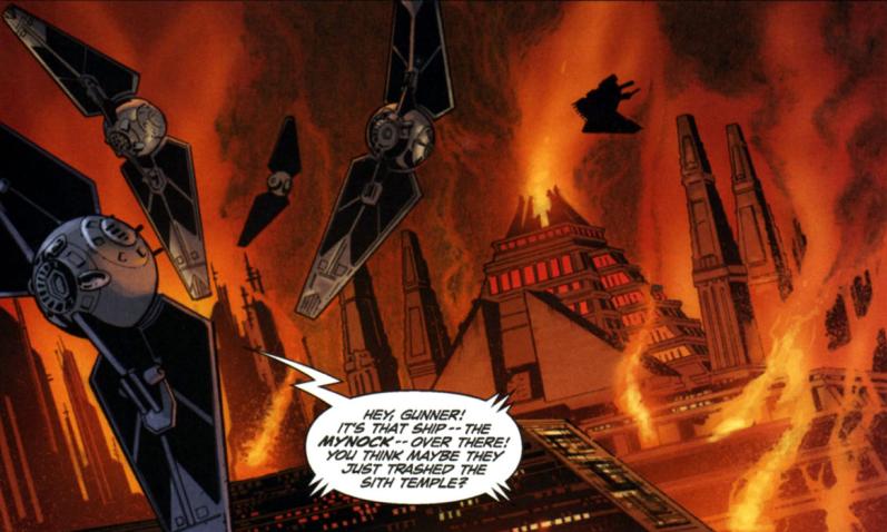 Gdy kilka dni później w Świątyni Sithów, moff Yage wysłał Eskadrę do unieszkodliwienia intruza, którym okazał się właśnie Mynock. W trakcie wykonywania zadania dywizjon dostał jednak rozkaz wycofania się. Oficjalnym powodem był fakt, że Sithowie nie tolerowali żadnych statków w swojej przestrzeni powietrznej.
