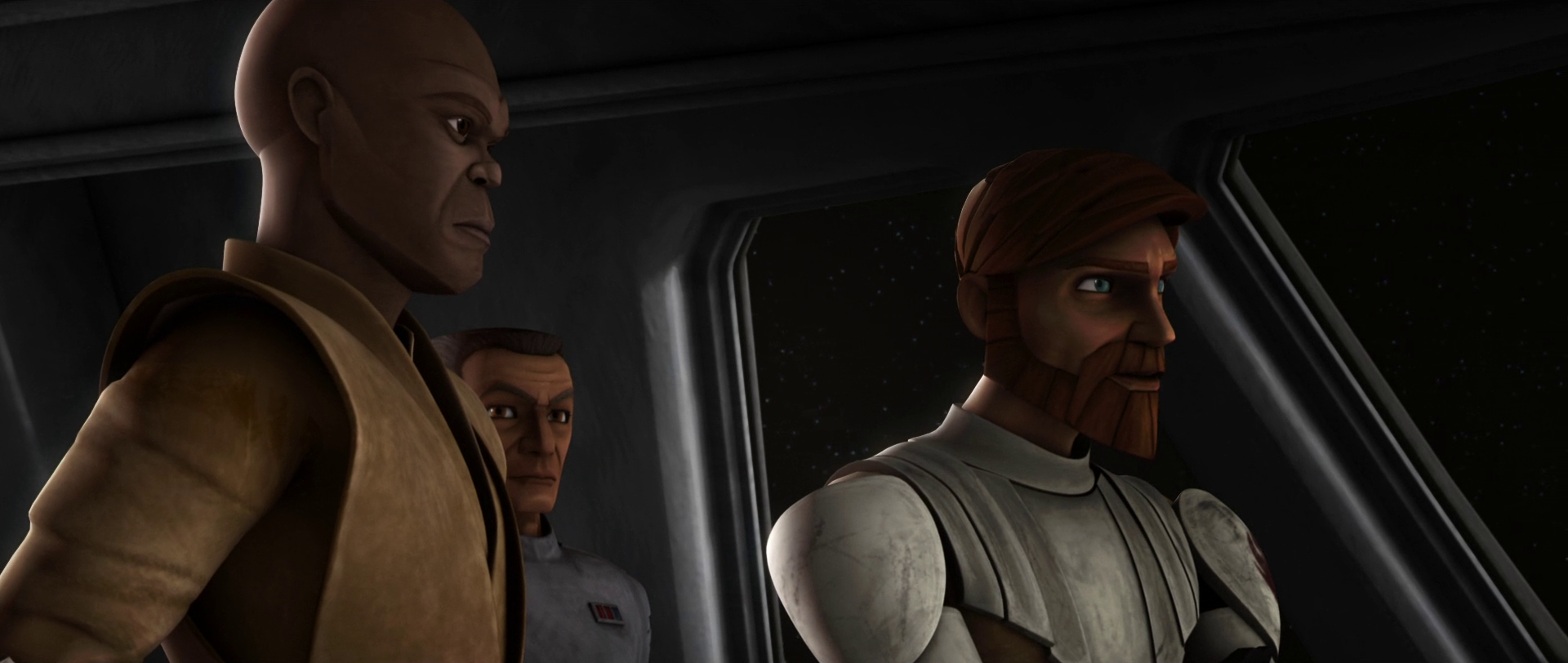 Następnie Windu holograficznie był obecny na zebraniu Rady Jedi, podczas którego Anakin, Obi-Wan, Ahsoka i admirał Wullf Yularen złożyli meldunek z misji na Kirosie. Wedle ich ustaleń Zygerrianie mieli napaść na kolonię Togrutan i uprowadzić ich całkowicie z powierzchni. W ocenie Rady miało to wskazywać na powrót Zygerriańskiego Imperium Niewolników, które zjednoczyło się z Separatystami, a wedle przeczucia Yody również z Sithami.[38]