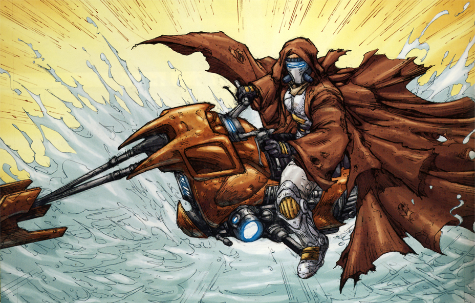 Po wylądowaniu na planecie Kenobi użył śmigacza do przemierzenia bagien, dzięki czemu zamierzał dostać się do miasta niepostrzeżenie. Nieszczęśliwie Jedi został napadnięty przez gang śmigaczy. Podczas pościgu przez mokradła Kenobi zdołał zniszczyć sześć pojazdów. Ostatnie dwa dotarły za nim do miasta. Tam jeden z nich rozbił się o most linowy. Ostatniego bandytę Obi-Wan zabił przy użyciu miecza świetlnego. Jego pokaz zwrócił uwagę zabójców Czarnego Słońca. Po pokonaniu jednego z nich Jedi zdołał przekonać pozostałych do ucieczki. Wtedy spotkał się z Aaylą Securą.