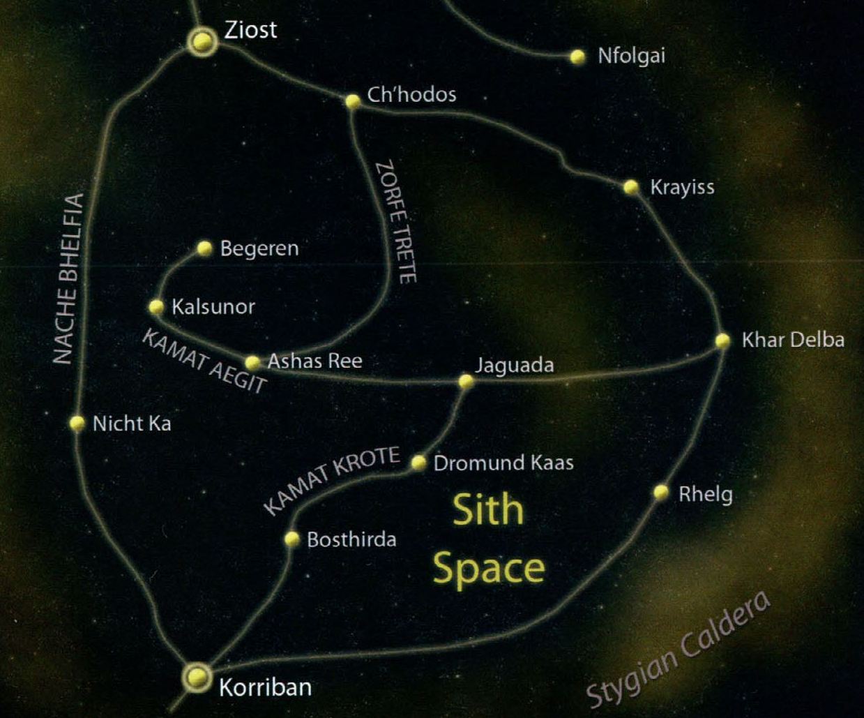 Nache Bhelfia była trasą nadptrzestrzenną znajdującą się wewnątrz Kotła Stygiańskiego na obszarze w sektorze Esstran, który kontrolowało do roku 5000 BBY Imperium Sithów.[1] Odkryta jakiś czas po przybyciu Wygnańców w czasie Stuletniej Ciemności przez Sorzus Syn i Remulusa Dreypę Nache Bhelfia łączyła pętlą pięć najważniejszych świętych światów Sithów, Ziost, Korriban, Rhelg, Krayiss oraz Khar Delbę.[2] Z czasem, chociaż niezapomniana, trasa ta przestała być wykorzystywana, aż do roku 19 BBY, kiedy to Ekim Ryelli poprowadził ekspedycję badawczą na Nicht Ka.[3]