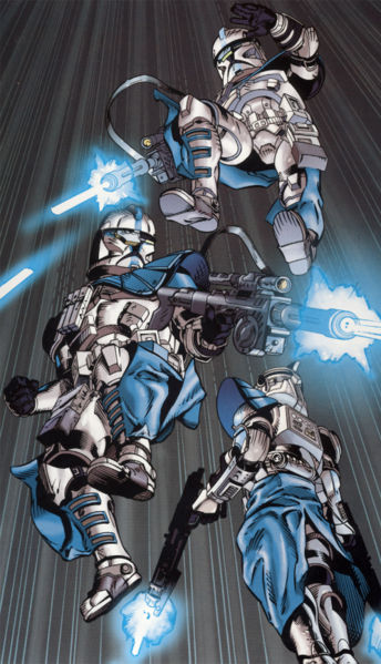 Klony z plecakami odrzutowymiNiektóre klony wyposażane były w plecaki odrzutowe, umożliwiające im walkę z powietrza lub pokonywanie średnich wysokości. Jedyną modyfikacją pancerza było w takim przypadku uzupełnienie o sam plecak. |