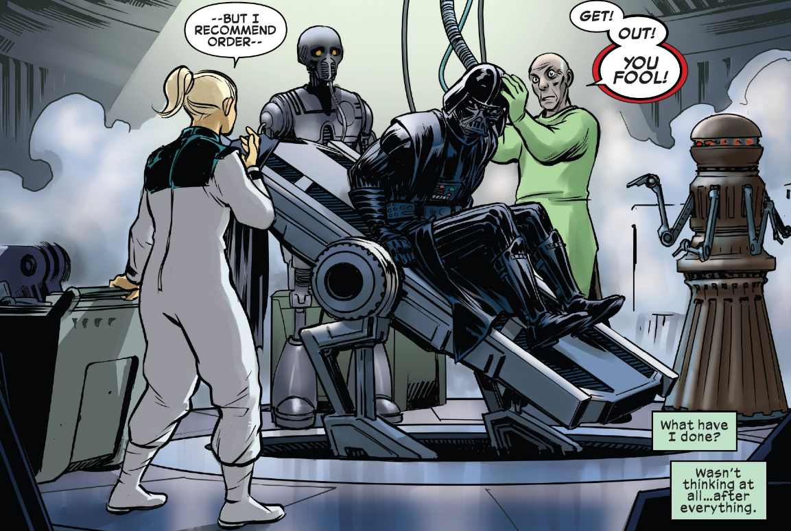 Pomiędzy rokiem 1 BBY a 0 BBY udała się do hangaru podczas lądowania promu Vadera. W tłumie zauważył ją jednak doktor, który zwrócił jej uwagę, że miała zająć się przygotowaniem ambulatorium do operacji. Kobieta udała się więc do magazynu zapasów medycznych, gdzie zaczęła zbierać zaopatrzenie. Nagle dostrzegła przechodzącego korytarzem Vadera, a pielęgniarka wychodząc z pomieszczenia przewróciła się, co Vader zignorował idąc dalej. Pobiegła więc do ambulatorium, gdzie Sith przygotowywał się do zabiegu. Zgłosiła doktorowi kończący się zapas kondensatorów, na co ten nakrzyczał na nią, aby wyszła niezwłocznie z sali. Kobieta zaczęła przepraszać, podczas gdy Vader odepchnął mężczyznę Mocą i poradził mu, aby panował nad swoim ambulatorium, albo zastąpi go kimś innym. Pielęgniarka w tym czasie wybiegła z pomieszczenia i zrozumiała, że Mroczny Lord Sithów nie ukarał jej, lecz doktora, co zinterpretowała jako znak, że ten nie chce jej skrzywdzić. Po skończonym zabiegu obaj wyszli z sali, przed którą kobieta na nich czekała. Lekarz polecił jej posprzątać, co też ta zrobiła. Czyszcząc salę znalazła wyjęty z ciała Vadera element, który zabrała, aby dołączyć go do swojej kolekcji.
