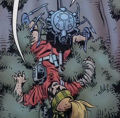 Opis: B-6 ratuje swoją panią po upadku z klifu. Źródło: Misja Lorda Vadera 1 Autor: Dave Gibbons Licencja: Ta grafika jest chroniona prawem autorskim, wykorzystano ją tu dla ilustracji autonomicznego artykułu (lub artykułów), zgodnie z zasadą dozwolonego użytku, na prawie cytatu (Ustawa o prawie autorskim i prawach pokrewnych, art. 29). |