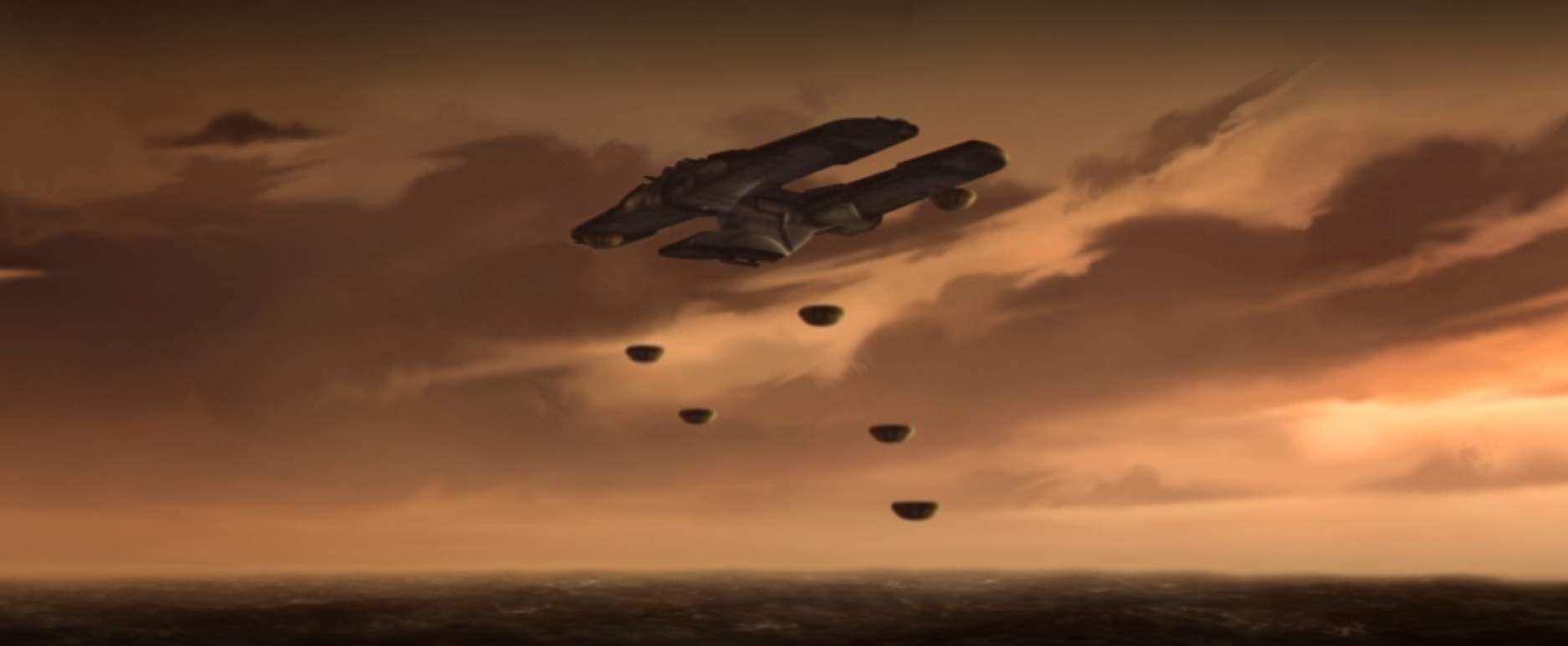 Opis: Barka desantowa C-9979 zrzuca hydroidomeduzy na Kalamar. Źródło: Autor: Lucasfilm Animation Licencja: Ta grafika jest chroniona prawem autorskim, wykorzystano ją tu dla ilustracji autonomicznego artykułu (lub artykułów), zgodnie z zasadą dozwolonego użytku, na prawie cytatu (Ustawa o prawie autorskim i prawach pokrewnych, art. 29). |