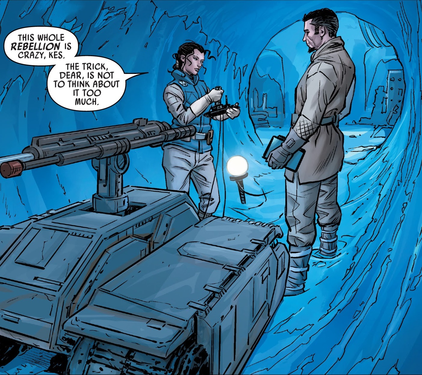 Opis: Kes Dameron i Shara Bey w czasie budowy Bazy Echo. Źródło: Echo zwycięstwa Autor: Luke Ross Licencja: Ta grafika jest chroniona prawem autorskim, wykorzystano ją tu dla ilustracji autonomicznego artykułu (lub artykułów), zgodnie z zasadą dozwolonego użytku, na prawie cytatu (Ustawa o prawie autorskim i prawach pokrewnych, art. 29). |