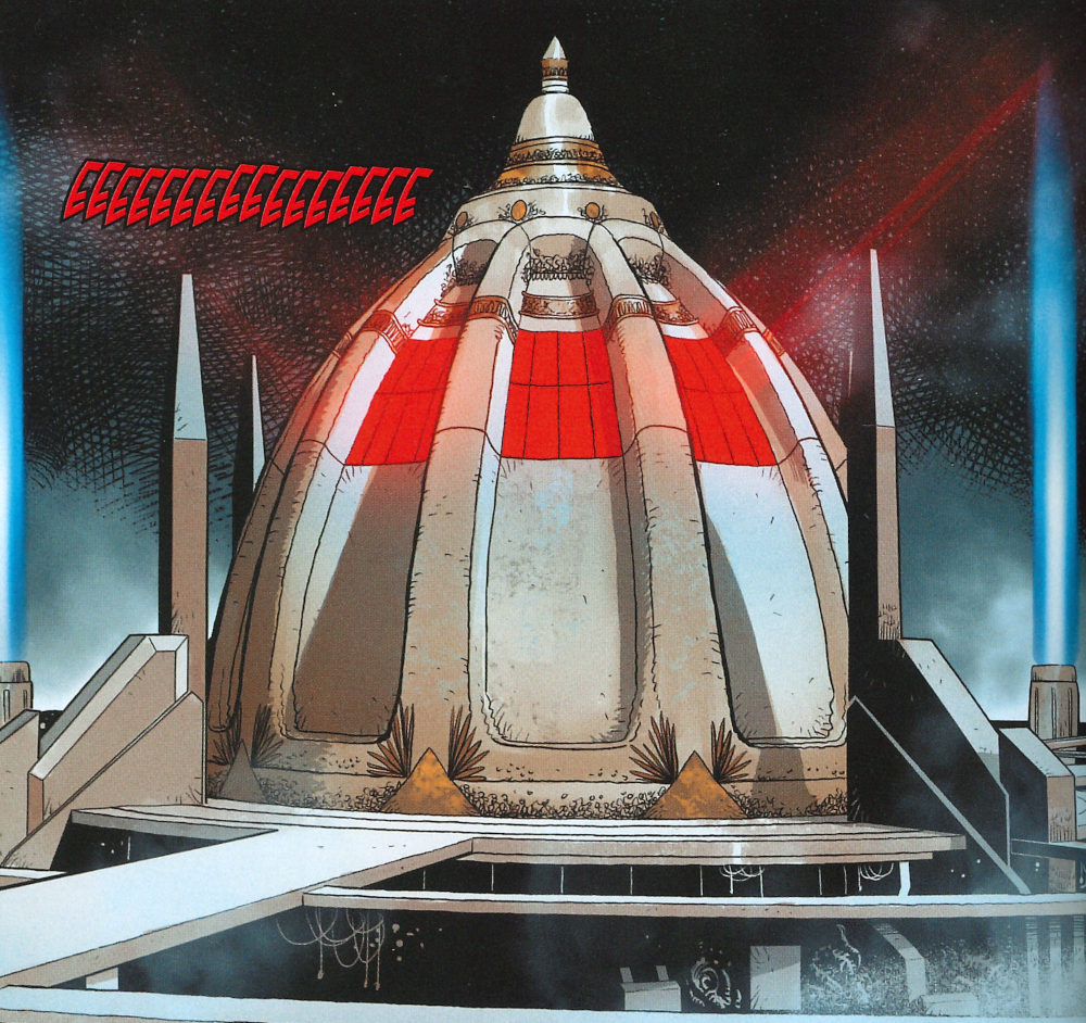 Opis: Widok budynku magazynu kyberów w Cytadelii Sithów. Źródło: Darth Vader 11: Prosto w ogień, część 6 Autor: Raffaele Ienco Licencja: Ta grafika jest chroniona prawem autorskim, wykorzystano ją tu dla ilustracji autonomicznego artykułu (lub artykułów), zgodnie z zasadą dozwolonego użytku, na prawie cytatu (Ustawa o prawie autorskim i prawach pokrewnych, art. 29). |