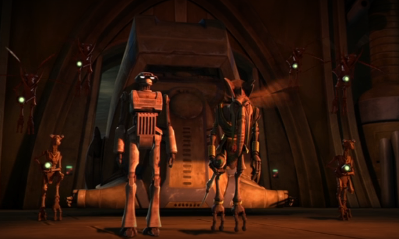 Opis: Poggle Mniejszy i TX-21 wychodzą na spotkanie Ahsoce Tano i Barrissie Offee. Źródło: Autor: Lucasfilm Animation Licencja: Ta grafika jest chroniona prawem autorskim, wykorzystano ją tu dla ilustracji autonomicznego artykułu (lub artykułów), zgodnie z zasadą dozwolonego użytku, na prawie cytatu (Ustawa o prawie autorskim i prawach pokrewnych, art. 29). |