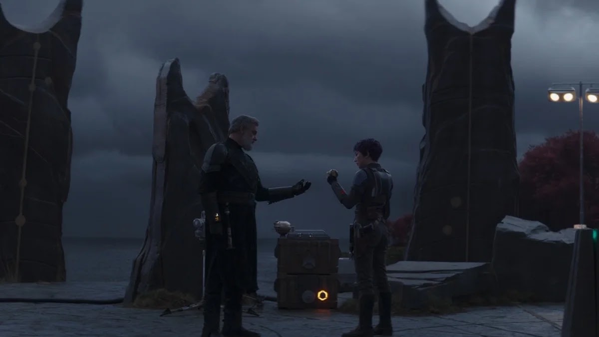 Opis: Sabine Wren oddaje artefakt Baylanowi Skollowi . Źródło: Autor: Lucasfilm Ltd. Licencja: Ta grafika jest chroniona prawem autorskim, wykorzystano ją tu dla ilustracji autonomicznego artykułu (lub artykułów), zgodnie z zasadą dozwolonego użytku, na prawie cytatu (Ustawa o prawie autorskim i prawach pokrewnych, art. 29). |