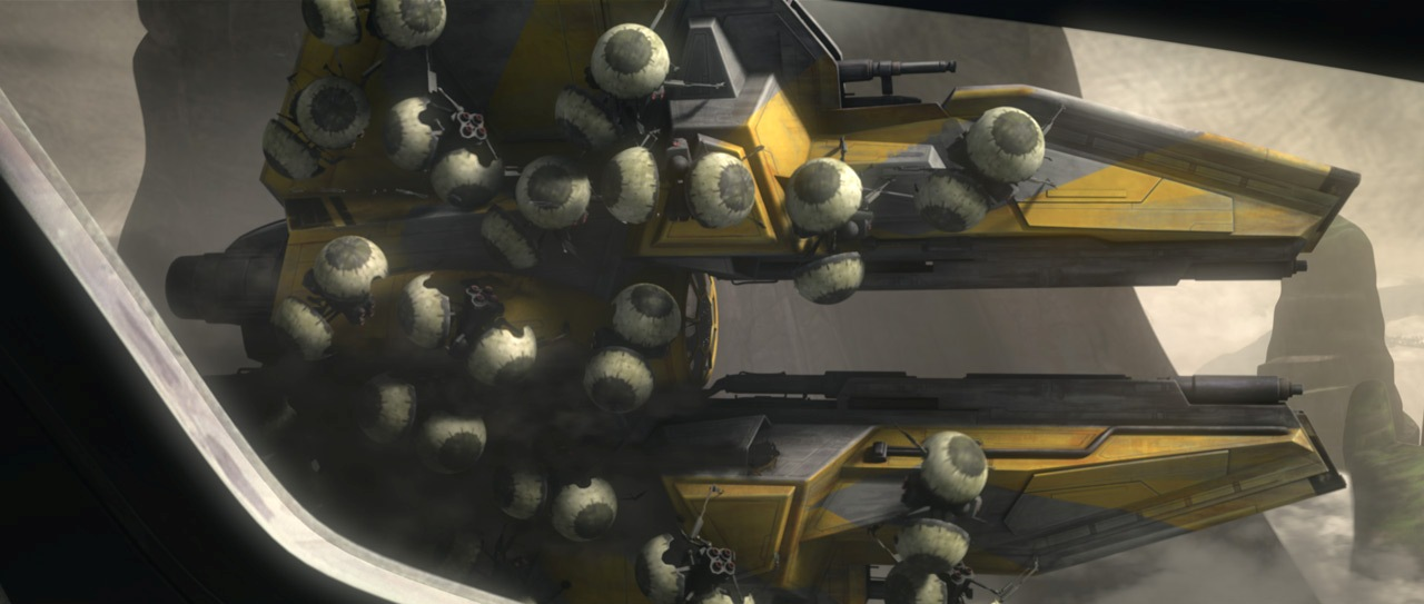Opis: Myśliwiec Anakina Skywalkera, niszczony przez buzz-droidy podczas inwazji Separatystów na Cato Neimoidię. Źródło: Autor: Lucasfilm Animation Licencja: Ta grafika jest chroniona prawem autorskim, wykorzystano ją tu dla ilustracji autonomicznego artykułu (lub artykułów), zgodnie z zasadą dozwolonego użytku, na prawie cytatu (Ustawa o prawie autorskim i prawach pokrewnych, art. 29). |