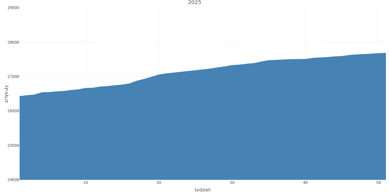 Opis: Wykres przedstawiający zmiany liczby artykułów w Bibliotece Ossus w 2025 roku. Źródło: Nie dotyczy Autor: Michał Komsa Licencja: Ja, twórca tej grafiki, udostępniam ją jako własność publiczną. |