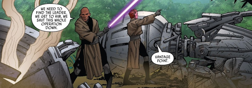 Windu uznał za konieczne namierzenie AD-W4, którego pozbycie się mogłoby zamknąć działania Separatystów, a gdy dostali się na wzniesienie, dostrzegli prawdziwą skalę całego przedsięwzięcia.[3] Razem zeszli na dół i zaatakowali obecne tam droidy. Rissa zapytała o plan, na co Windu wskazał jej na pokierowanie się Mocą. Następnie rzucił się na jeden z kombajnów, a Mano rzuciła mu swój miecz świetlny, aby mógł łatwiej powalić maszynę. W międzyczasie zaszły ją trzy droidy, które zestrzeliła podniesionym z ziemi karabinem. Gdy skończyła, Mace zniszczył już kombajn i oddał jej broń. Ocenił, iż powierzchnię może pokrywać wielokrotnie więcej takich machin, przez co eliminowanie ich jedna po drugiej może okazać się nieskuteczne. Wobec tego za konieczne uznał namierzenie bazy wroga. Udali się w dalszą drogę przez las, po drodze eliminując jeden z patroli. Mano zdziwiła się widząc mobolizację droidów, lecz Windu wyjaśnił jej, że mimo chwilowej przewagi, na tle trwającej wojny wyeliminowanie ich będzie korzystne dla Separatystów. Za kolejnymi krzakami dostrzegli następny liczny zastęp droidów i mistrz ocenił, iż powinni przeprowadzić atak dopiero w pełnej grupie. Postanowili więc wrócić na pokład Westwind, gdzie poczekali na powrót pozostałej dwójki Jedi. Gdy spotkali się przy promie, Prosset ku zaskoczeniu pozostałych słownie zaatakował Mace'a, którego oskarżył o wspólne działanie z Radą Jedi w celu przejęcia miejscowych źródeł energii. Gdy Rissa nie zgodziła się z jego słowami, uznał ją za młodą i naiwną, po czym w dalszych wypowiedziach wytknął Windu śmierć tubylców i zrównał działania Zakonu z operacją Separatystów. Po chwili konflikt zaognił się i Dibs uderzył Mace'a, następnie wyciągając przeciwko niemu miecz świetlny. Mano chciała zainterweniować, lecz Fisto powstrzymał ją, wskazując, że ci muszą sami rozwiązać ten spór.[2]