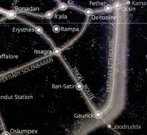 Początkiem Trasy Tingel był układ Bonadan, który jednocześnie stanowił koniec Drogi Hydiańskiej, a także punkt na Solenbarańskim Szlaku Kupieckim. Następnie trasa nadprzestrzenna przechodziła przez układ Erysthes oraz układ Issagra, w którym przecinała się z Trzeciorzędnym Solenbarańskim, a także układ Ban-Satir oraz układ Gaurick, który stanowił jednocześnie początek Trzeciorzędnej Trasy Ettiańskiej. Za Gaurickiem Trasa Tingel opuszczała Sektor Wspólny, a także Zewnętrzne Rubieże i wchodziła w obszar Dzikiej Przestrzeni. Przechodziła tam miedzy innymi przez układ Joodrudda.