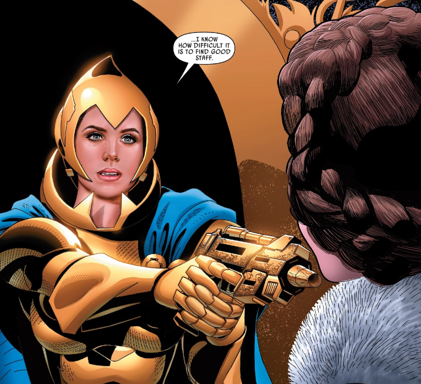 Po dłuższej rozmowę dalsza wymiana została przerwana dołączeniem do kobiet Luke'a Skywalkera, który zapytał o tożsamość królowej. Leia przedstawiła swoją współrozmówczynię, na co ta poprosiła, aby zwracali się do niej po imieniu, po czym przyznała, że dla własnego bezpieczeństwa powinni opuścić już kombajn. Zapewniła, iż otworzy przejścia dla strażników, dzięki czemu zdołają bezpiecznie uciec, a ona odsunie od siebie wszelnie podejrzenia. Leia poprosiła o 5 minut czasu, po czym razem ze Skywalkerem udali się do opuszczenia pokładu. Wkrótce królowa nadała skierowany do szturmowców komunikat o otwarciu wszystkich dróg na mostek i nakazała powstrzymanie rebeliantów. Chwilę później kombajn został zatopiony, a Trios razem z Kancharem ewakuowała się na pokładzie niewielkiego statku. Komandor wyraził współczucie wobec utraty tak istotnego dla jej ludu pojazdu, lecz królowa nie przejęła się stratą i zapewniła, że triumf ostatecznie będzie po ich stronie.[12]