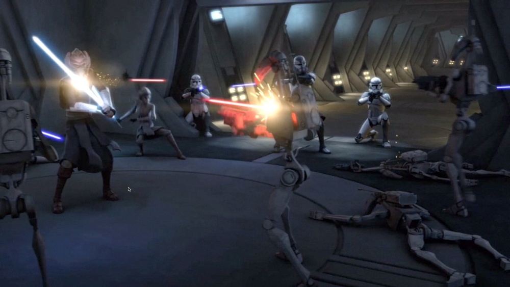 Chwilę po aresztowaniu R2-D2 i C-3PO pięć gwiezdnych niszczycieli typu Venator zaatakowało osamotnioną jednostkę wroga. Z pokładów krążowników wystartowały myśliwce ARC-170 i bombowce Y-wing, które ostrzelały okręt Separatystów, dzięki czemu oddział klonów, dowodzony przez Plo Koona, dokonał abordażu. W tym samym czasie Adi Gallia i przetrzymywani z nią żołnierze wydostali się z niewoli i wspomogli towarzyszy broni w walce. Jedi i klony szybko przełamali opór droidów bojowych. Tymczasem Grievous uciekł ze swojego statku, unikając aresztowania. Kiedy Jedi zabezpieczyli wejście, zauważyli ukrywających się R2-D2 i C-3PO. Wkrótce klony zniszczyły pozostałe droidy i bitwa dobiegła końca.